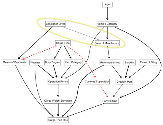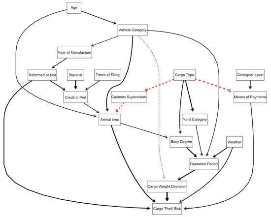 31]. The network provides a very clear view of the relevant features of cargo theft risk during the delivery process, as well as the relationship between the features. In the figures, a directed arc between nodes indicates the dependency relationship between the two features. More specifically, the thicker the arc is the stronger the dependency. Moreover, we measure arc strength in the network structure according to the score gain/loss which would be caused by the arc’s removal, while keeping the rest of the network structure fixed. In other words, it is the difference between the score of the network with and without the arc. Negative values correspond to decreases in the network score and positive values correspond to increases in the network score (the stronger the relationship is, the more negative the difference). In addition, the arcs in red dotted lines highlight differences between these network structures.