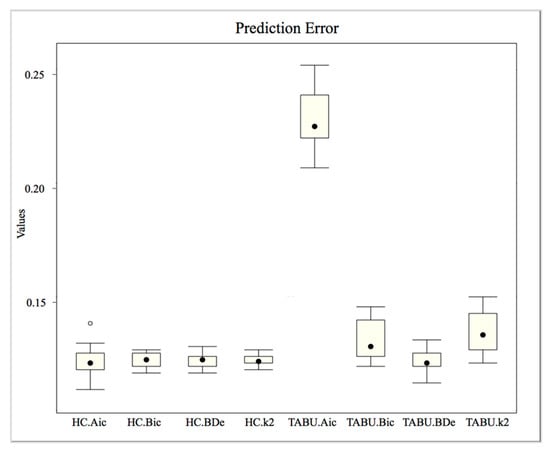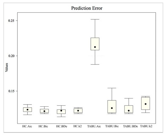 In the case of the structure learning algorithm with HC, the medians of the predictive errors with Aic, Bic, BDe and k2 are similar, and the range is relatively small. Nevertheless, there is an outlier in the predictive errors of HC.Aic, which indicates the volatility. Moreover, the predictive error of HC.k2 has the smallest range while also being most stable. In the case of the structure learning algorithm with TABU, the ranges of predictive error are obviously larger than with HC. More specifically, the TABU.BDe performs best when the structure learning algorithm is TABU.