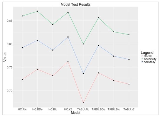 Figure 10 presents the results of the model testing with various combinations of structure learning algorithms and score functions. All models except for TABU.Aic have an accuracy above 80%, which indicates that the risk prediction model based on Bayesian network has high reliability and accuracy. The predictive model of HC.k2 has the highest accuracy and recall, and the predictive model of HC.BDe has the highest specificity. Considering three indices of accuracy, recall, specificity, the predictive models using HC performs better than models using TABU.