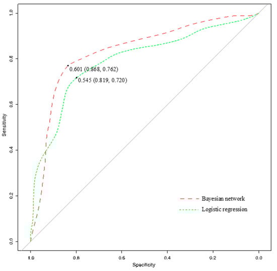 Figure 11, which shows values at the tangent point of ROC curve, indicating the higher sensitivity and specificity of Bayesian network. The AUC of Bayesian network, at 0.834, is higher than the AUC of logistic regression, with 0.771. This result also indicates that Bayesian network performs better for this binary classification.