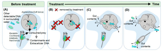 Diagram of necessity of proper pretreatment process in rotifers gut contents analysis; (A) Without treatment for removing contaminants and other detectable DNA including extracellular DNA, there is possibility to be confused that detected DNA is from the rotifers gut contents or not, (B) Through proper treatment, contaminants and other detectable DNA can be removed without damaging the rotifer individuals, (C) and (D) Rotifer individuals can be damaged and their gut contents can be overflowed by excessive treatment according to their lorica characteristics.