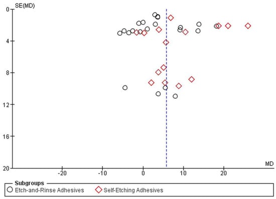 Meta-analysis was conducted using the “Review Manager Software (RMS)” (version 5.3) from the Cochrane Collaboration (Copenhagen, Denmark), and the mean difference with 95% confidence interval (CI) was calculated for mean bond strength of all groups of the studies included using the inverse variance method. The p-value for significance was set at p < 0.05. Statistical homogeneity (I2) of the treatment effect was assessed by the modified chi-square test (Cochran’s Q). The assessment indicated that there was statistical homogeneity when p > 0.10. Global and subgroup analyses were carried out (subgroups were arranged in ER or SE adhesive system and µSBS or µTBS).