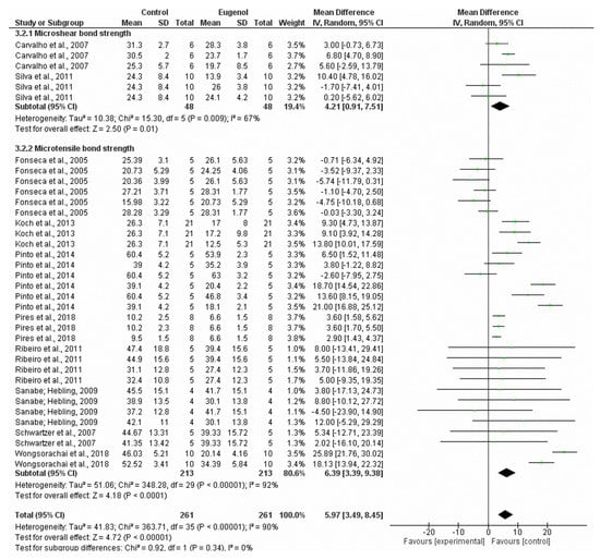 The bonding performance of dental adhesives and luting agents to dentin “contaminated” with eugenol [,,,,,,] has been the subject of a plethora of investigations during the last two decades. Nevertheless, the controversial results, inconsistencies, and inaccuracies of these studies have not provided the dentists with any evidence to support a judicious clinical decision considering the adverse effect of eugenol on adhesive dentistry. In order to increase the quality of the current systematic review and meta-analysis, we systematized all the selected studies into subgroups: (1) conventional ER adhesive system or SE adhesive system and, (2) evaluation through µSBS or µTBS. For both subgroups analyses as well as for the global analysis, it was found that the presence of residual eugenol jeopardized the bond strength of resin-based materials.