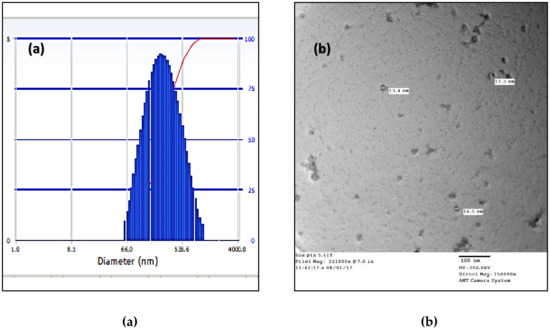 The particle size was found to be (Figure 2a) 284.7 nm and the PDI was around 0.146 which lies in the desired range of 200–300 nm suitable for both active and passive uptake into cells. Further, the TEM analysis showed a particle size (Figure 2b) between 12.5 nm and 18.0 nm, affirming that the nanoparticle is in the preferred nanoscale.