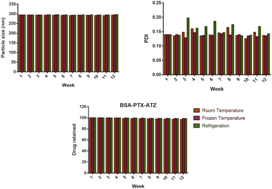 The parameters indicating stability over three months have been shown in Figure 4. which indicate very slight fluctuations showing great stability of the formulation over a long time. The particle size seemed to be around 287.5 nm at room temperature but was more stable when in the frozen state. The PDI (polydispersity index) was around 0.168 at the end of 12 weeks and has stayed stable throughout. The drug loss was 1.1% at room temperature and was of the order of 0.8% in the frozen conditions showing minimal drug loss during the storage. Hence, it can be inferred that the formulation has better stability in frozen state than at room temperature indicating an increase in shelf life when stored frozen. The p-value > 0.05 indicates that there is not much difference in the variance in terms of particle size, PDI and drug retained within the formulation over a period, showing the stability of the formulation.
