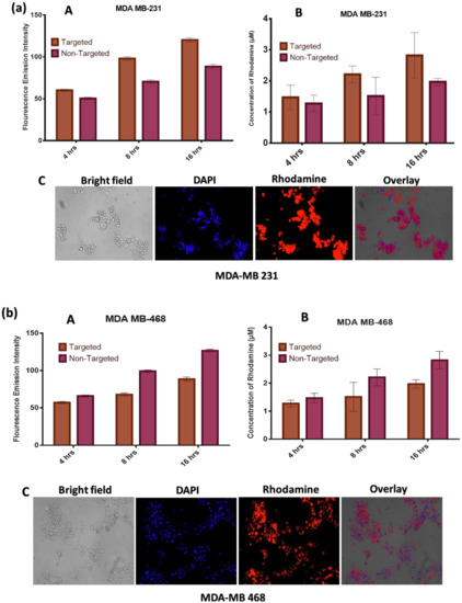 Cell uptake studies in (a) MDA-MB-231: (A) Uptake based on Fluorescence Intensity; (B)Uptake based on Concentration of Rhodamine; (C) Uptake from Fluorescence Microscopy and (b) MDA-MB-468 cell lines: (A) Uptake based on Fluorescence Intensity; (B)Uptake based on Concentration of Rhodamine; (C) Uptake from Fluorescence Microscopy.