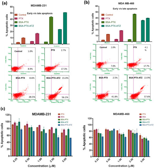 (a) Apoptosis assay studies in MDA-MB-231 for the hypoxia targeting drug delivery system BSA-PTX-ATZ; (b) Apoptosis assay studies in MDA-MB-468 for the hypoxia targeting drug delivery system BSA-PTX-ATZ; (c) Apoptosis assay studies in MDA-MB-231 and MDA-MB-468 based on the concentration of BSA-PTX-ATZ.