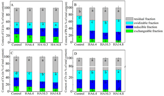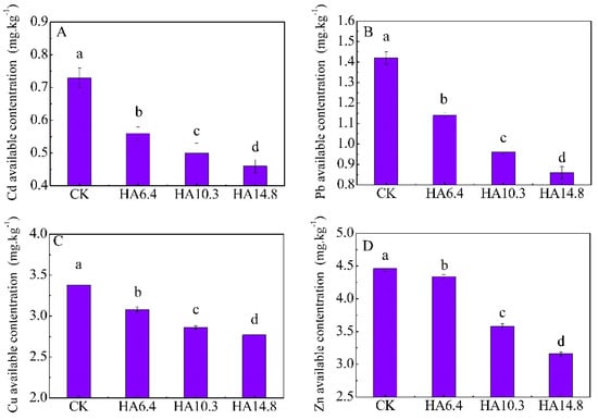 The contents of the DTPA-extracted metals contents were significantly decreased with HA treatment (p < 0.05, Figure 1) as compared with the CK treatment. The HA10.8-amended soil presented lower concentrations of DTPA-extracted metals than the other treated soils, with DTPA-extracted Cd, Pb, Cu, and Zn contents reduced by 37%, 39%, 18%, and 29%, respectively, as compared with those in CK. The reduction of the DTPA-extracted metal fraction was more significant for Cd and Pb than for Cu and Zn.