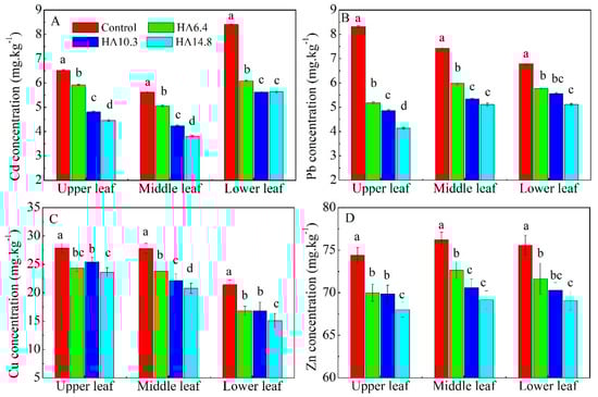 Tobacco has the ability to accumulate metals and transport them from the roots into the shoots. The contents of metals in soil and tobacco leaves were analyzed. Here “accumulation” means the concentration of a metal in the plant is higher than that in the soil. Figure 3 shows that tobacco had an accumulation effect for Cd, while it had only an uptake effect for Pb, Cu, and Zn. The soils treated with HA received a dramatic decrease in the Cd, Pb, Cu, and Zn contents in the tobacco leaves (p < 0.05, Figure 3), and with the HA dosage increasing, the uptake of metals in the tobacco leaves decreased. It should be noted that in the HA14.8 treatment, the Cd contents in the upper, middle, and lower parts of the leaves were reduced by 32%, 32%, and 33%, and those of Pb were reduced by 50%, 31%, and 25%, respectively. Additionally, the Cu contents were reduced by 15%, 25%, and 29%, and the Zn contents were reduced by 9%, 9%, and 9%, respectively. That is to say, the inhibit effect of Cd and Pb is much stronger than that of Cu and Zn.