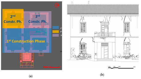 (a) Plan of the construction phases of the historic building; (b) east façade of Villa Klonaridi indicating the pathology of the walls.