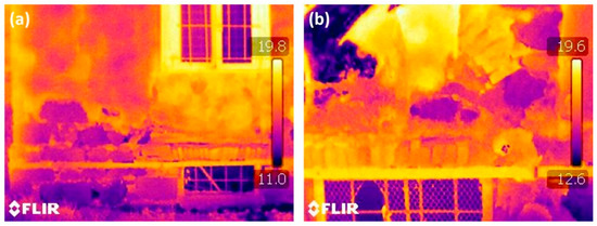 IRT images of the north façade: (a) moisture issues are observed in the lower part of the 3rd construction phase structure; (b) temperature variations and different thermal conductivity behavior is observed between the building materials of the first and the third construction phase.