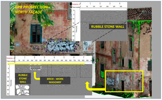 GPR results provided information regarding the width of the construction walls, as well as information related to the manner of construction and the masonry’s stratigraphy [45]. Additionally, GPR results indicated flaws and diffractions located in the internal of the masonry (Figure 7). Pathology documentation was obtained utilizing architectural documentation studies. Moreover, in Villa Klonaridi, a vast variation of materials was encountered. The materials identified were lime-stones, clay bricks, mortars and plasters [49]. The results regarding the structure of the historic building, presented variations among the construction phases. The first construction phase consists of a thick three-layered rubble-stone masonry (70 cm) with brick walls below the openings and brick relieving arches above them. The second construction phase consists also of a three-layered rubble-stone masonry (60 cm), while in the third construction phase the thickness of the walls are larger than the second (65 cm), and the structure is consisted of a combination of brick walls with rubble-stone masonry.