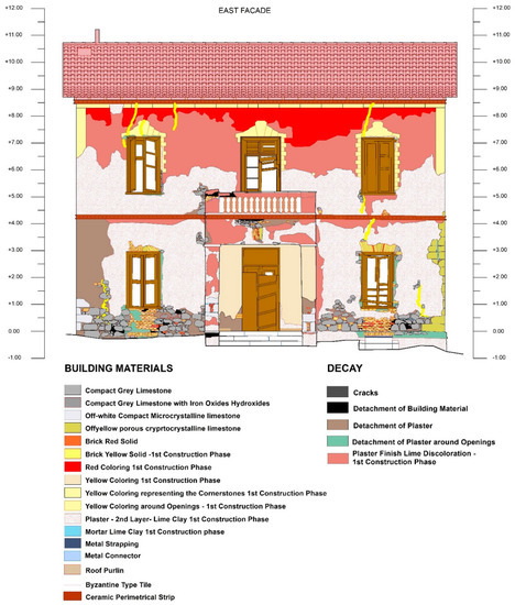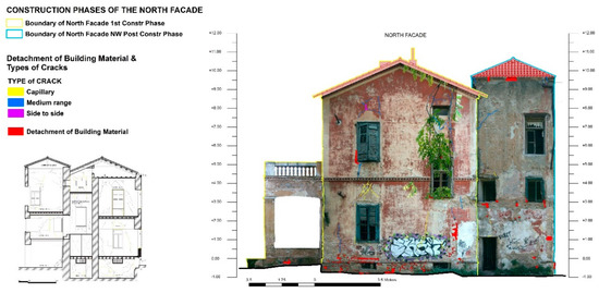 In the north façade of the building (Figure 13), excessive amount of building material detachment is concentrated in the area where the third construction phase is located (northwest), while a side to side crack, located above the first floor window of the first construction phase, can be also noticed in the architectural drawing. In addition, detachment of building material located in the lower part of the façade, indicates phenomena of rising damp, nevertheless, severe cracking in the structure of the first construction phase is not noticed.