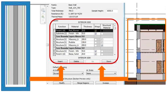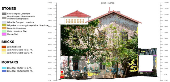 A methodological framework that incorporates data deriving from the multidisciplinary documentation and providing information regarding the current state of preservation and the structural assessment of the masonry of the historic building may serve as a valuable tool which can assist in the creation of an HBIM. Through this process, the 3D data acquisition information is combined with the results from the building materials analysis in a 2D environment initially allowing the qualitative and quantitative information to be projected on a BIM that has derived from both architectural documentation data and the 3D point cloud from geometric documentation. Moreover, during the HBIM development, various types of information incorporating data regarding the state of preservation were utilized. Within the HBIM, each element obtained characteristics on both morphological and typological terms. Every element was enriched by the information that derived from the multidisciplinary documentation process such as its morphological features, the type of building materials, its geometric irregularities in conjunction with the standardized structural elements, its variation terms of susceptibility regarding the decay mechanisms that affect the structure, depending on the construction phase etc. In Figure 16, the stratigraphic information regarding the structural walls is presented.
