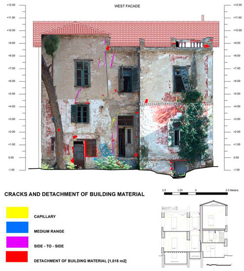 In Figure 12, the thematic map of the west façade demonstrates the severe deterioration of the walls, presenting cracks that reach the interior of the building and goes side-to-side, while capillary cracks are nearly absent. The area with the highest amount of cracking, is in fact one of the additions on the historic building and more specifically the third one, indicating a deterioration mechanism that affects the structure of the building as a whole. Given the fact that the cracks are located in the upper part of the façade, structural deformations, as well as possible moisture issues, emerge as possible decay factors which could interpret such degradation phenomena. Regarding the location of the cracks in the northwest upper part, information from the architectural drawings of the building, demonstrate that modifications were made and the restroom facilities were located in this area. Since the building was uninhabited for a very long time, plumbing system malfunctions could actively contribute to moisture accumulation and consequently to areas of remaining dampness. The cracks located near the interface of the 2nd and 3rd construction phase, can be attributed to incompatibility between the two structures and their building materials. Therefore, the extensive localization of the cracks, can be interpreted by such degradation parameters. In addition, the architectural section (Figure 12), demonstrates the extent of the side-to-side cracks that prevail in the third construction phase (northwest), further indicating its susceptibility to degradation phenomena.