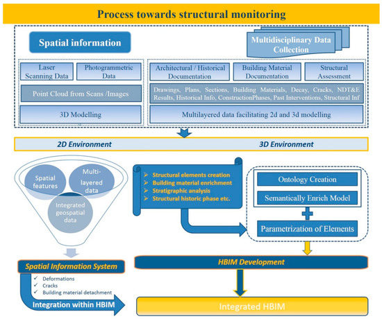 A workflow towards the HBIM creation including the multidisciplinary geometrical and non-geometrical data is herewith presented in Figure 20. The process incorporates data deriving from multidisciplinary documentation and provides information related to the current state of preservation and structural assessment of the masonry of a historic building and could be considered as a useful tool for the creation of an integrated HBIM. Through this process, the 3D data acquisition information are combined with the results from the building material analysis, the structural information and construction phases along with the resulting geospatial features deriving from a GIS environment, resulting in an integrated HBIM, where qualitative and quantitative information are classified and projected, in terms of semantic enrichment.