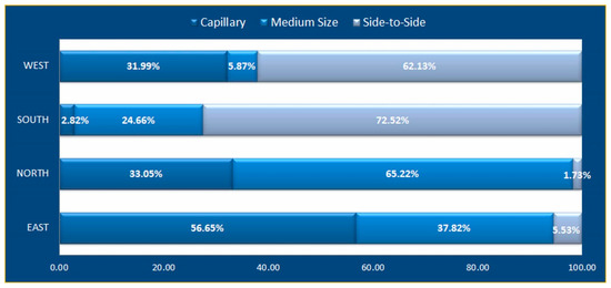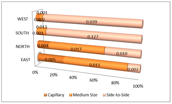 More specifically, the decay factors that prevail in the structure of the building in terms of cracks and loss of building material are presented through a diagram (Figure 21) deriving from the 2D GIS analysis. A high percentage in the length of the cracks was observed, mainly in the west and south façade with 62% and 72% side to side cracks respectively, thus assisting in the conclusion that the additional expansions of the historic building were of lower quality structure compared to the first construction phase. In addition, the capillary cracks prevail in the east façade, causing only superficial decay, indicating the cohesive structure of the first construction phase.