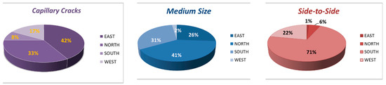 Comparative diagrams indicating the percentage of each façade of the building in regards to each type of crack.