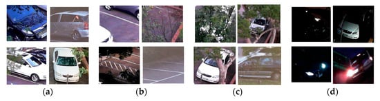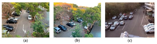 To evaluate and compare methods in real-world situations, we trained and tested them on the publicly available dataset, CNRPark + EXT [30] (the data viewpoint like Figure 1). In the dataset, label data from the CNN model and parking grid coordinates and image data are provided. In this study, we used LabelImg [31] to create training data for object detection with the YOLO model. In general, parking space detection may encounter different environmental constraints, as shown in Figure 2. The proposed method presented more reliability than did prior works, particularly when tested on a completely different subset of images. In a study, method performance was compared with the well-known architecture, AlexNet [32]. Our model also demonstrated highly promising performance compared with AlexNet. Moreover, our investigations indicated that our approach was more robust, stable, and well-generalized for unseen images captured from different camera viewpoints than were previous approaches for classifying parking space occupancy. Our approach displayed strong indications that it could be effectively generalized to other parking lots.
