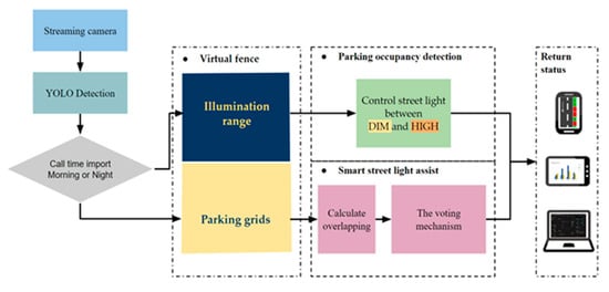 The proposed methodology is shown in Figure 5. The input video uses embedded hardware to directly connect to existing street surveillance. Human and vehicle detection involves high-performance deep learning algorithms, while the YOLO of the bounding box and parking grid calculate overlapping areas according to the intersection-area-to-voting-mechanism ratio from the sequence image to identify the occupancy status. The streetlights automatically light up from DIM settings from the detection results. All steps are processed by the Jetson TX2.