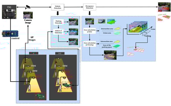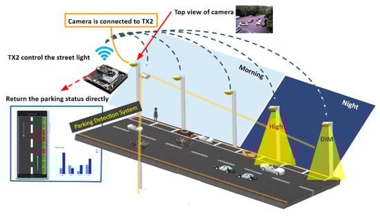 This section describes our parking detection system on street scenes. This system includes materials, methods, vehicle detection, occupancy identification with the voting mechanism in postprocessing, and streetlight control at night to assist in detection, as shown in Figure 3. A diagram for the proposed system using an existing camera-based Jetson TX2 is depicted in Figure 4. The architecture diagram shows that we received real-time images from a camera mounted on a streetlight. All operations, including detection, identification, and control, are processed on the Jetson TX2.