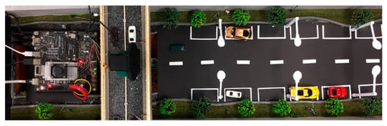 We created a model to simulate real scenes according to camera images detecting moving objects. The streetlight switched from the dim to the high state when a car entered a roadside parking space; then, the occupancy detection model detected and recorded when the car occupied the parking space. In the model, three LEDs on both sides of the street represent the streetlight. A 3.1–3.4 V white LED was soldered to a GPIO on the Jetson TX2. The status of parking grids was identified through the YOLO model, IOU, and overlapping judgment; the voting mechanism ensured that the target stopped and occupied the parking space. All these processes were executed on the Jetson TX2. Figure 14 depicts the final demonstration of the proposed model comprising two parts, namely the streetlight and parking occupancy detection sections. The automatic streetlight system switches to the dim setting at nighttime and the high setting during vehicle movement. In the daytime, no LEDs glowed. Time was the key that prompted the streetlight to switch between day and night settings. Figure 14a shows that at nighttime, no motion was detected by the camera, and therefore, the streetlight remained in the dim state. The proposed model, illustrated in Figure 14b–d, was designed only for the detection model to detect the object’s presence from real-time images and glow more brightly; then, the remaining LEDs maintain their dim state. In Figure 14b, for instance, the first set of LEDs glowed at the high setting when an object was detected by YOLO, the second set glowed before the object approached, and the remaining LEDs stayed in the dim state because it was nighttime. Moreover, when the object moved to the second set, the second set of LEDs remained in the high setting, the first set reverted to the dim state, and the third set switched to the high state for prelight mode, as displayed in Figure 14c. These results demonstrate the efficiency of the proposed idea and validate the proposed model.
