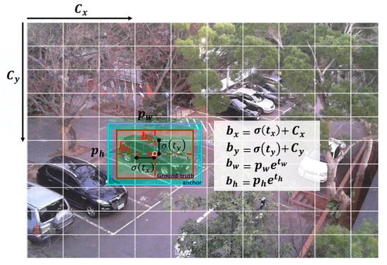YOLO cuts the original image into S × S nonrepetitive grid images, where S is the number of grids determined by users. The neural network uses anchor boxes to estimate the center of vehicles in a grid that is responsible for predicting vehicles. In each grid, the bounding box is estimated to generate four coordinates: ; represent the central coordinates of the predicted bounding boxes. represent the width and height of the predicted bounding boxes, respectively.