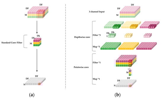 The deep separable convolution structure of MobileNet can obtain the same outputs as those of standard convolution with the same inputs. The depthwise phase requires M filters with one channel and a size of . The Pw phase requires N filters with M channels and a size of 1 × 1. In this case, the computing cost of the deep separable convolution structure is , approximately of that of standard convolution.