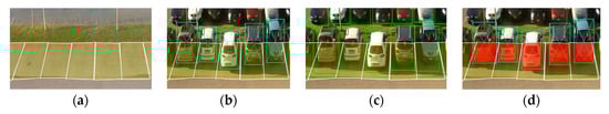 In the parking dataset, we used the center points of bounding boxes, which were predicted using YOLO to create a comparison table by using the methods of Acharya and Khoshelham [20] and Ciampi et al. [25]. The model achieved considerable accuracy, but the center point may have misjudged actual parking spaces because of the network surveillance camera’s perspective, as shown in Figure 10c. To resolve the problem of misaligned perspectives, we propose a method of YOLO detection and object overlapping identification to improve occupancy detection results and to identify the occupancy status with the voting mechanism. Our judgment method of the overlapping is presented below (see Figure 11).