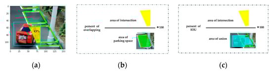 Overlapping and IOU comparison. (a) Original image. (b) Overlapping area of the car in the back and the parking space. (c) Overlapping area of the car in the front and the parking space.