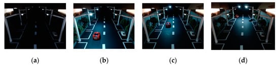 During the day, we could record and process parking parts and not activate part of the streetlight until night, when the streetlight system could assist in parking and lighting. Settings were divided into two parts: (1) when no objects were detected on the street, the streetlight remained on a dim settings, and (2) when an object appeared or entered the streetlight’s illumination range, the streetlight would brighten in advance of the object from the dim to the high stage, as shown in Figure 13. Smart streetlight automation may assist in parking safety and facilitate finding empty spaces.