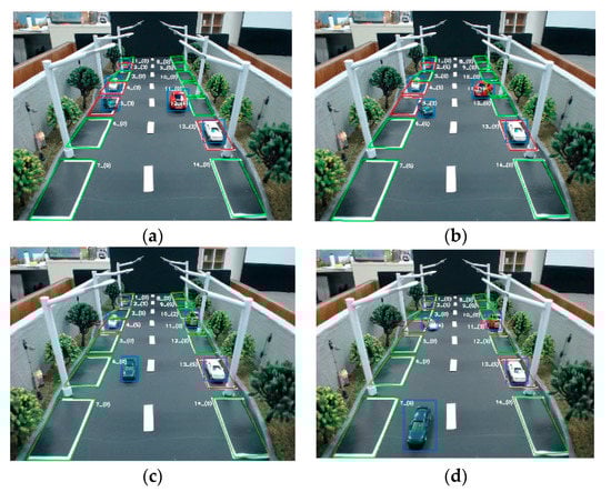 Streetlight control with the Jetson TX2. A sequence of images showed (a) the red car driving into the parking grid. (b) The model began to determine whether the red car occupied the space. (c,d) The voting mechanism verified that the red and blue cars stopped at parking grids.