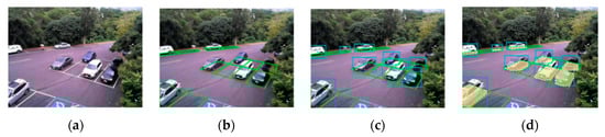 Occupancy detection process. (a) Original image of the input. (b) Green bounding boxes represent parking grids. (c) Blue bounding boxes from YOLO represent detected vehicles. (d) The yellow area was the intersection between parking grids and vehicles.