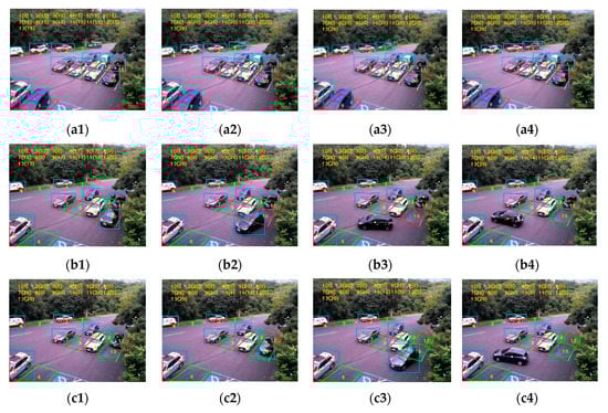 In case 1, Figure 17(a1–a4) demonstrates that a car approached parking space 1. Parking spaces in red represent occupied spaces, those in green represent free spaces, and those in blue represent bounding boxes of the predict model and signified vehicles intersecting with parking spaces. The model continued to detect and compare intersection areas to verify that vehicles were parked in parking spaces. Therefore, this model continued judgment through the voting mechanism over time. Case 2 is presented in Figure 17(b1–b4). The car in parking space No. 10 was ready to leave. The model identified that parking space 10 was occupied and continued to detect and compare the intersection area to ensure that the vehicle remained in the parking space. The model detected that the intersection area with the parking space was becoming smaller until the car completely left, after which the model detected that the parking space was empty and switched parking space 10 from red to green, thereby identifying the space as free. Case 3 is presented in Figure 17(c1–c4). It verified through the voting mechanism that cars did not affect judgment when passing through the parking space.