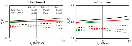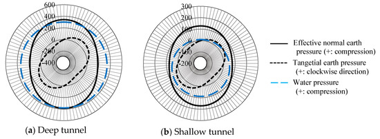 - rv < 1 < rh is for kn ≤ 100 MN/m3 while rv is close to 0, and rh < 1 for kn = 1000 MN/m3. This is because (1) for kn ≤ 100 MN/m3, the effective earth pressure acting on the lining, at the crown and invert are at the active side, and the at the spring line is at the passive side due to the ground reaction, and (2) for kn = 1000 MN/m3, is always at the active side and is close to zero for the deep tunnel due to ground self-stabilization, as shown in Figure 7b and Figure 8b.