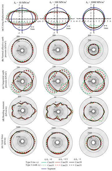 - As kn increases, decreases and the distribution shape of becomes more flat in the horizontal direction. This is because (1) the high water pressure in the deep tunnel reduces the lining diameter, (2) a larger kn decreases under the same displacement in the active side, and (3) as kn increases, the around the invert and crown decreases more than the at the spring line under the displacement in the active side because Kh0 = 0.5.