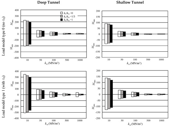Figure 7d and Figure 8d show the distribution of bending moment M for the deep tunnel and the shallow tunnel. To make each parameter’s effect clear, Figure 9 shows the maximum and minimum moment (Mmax, Mmin), respectively. From these figures, the following was found: