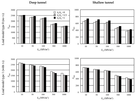 - As for Nmax in Figure 11, as kt increases, Nmax increases for load model type 0, and Nmax decreases for load model type 1. This is because Nmax appears at the invert for load model type 0 and at the spring line for load model 1, as shown in Figure 7, Figure 8 and Figure 12, and the influences of kt on Fh and Fv are reversed.