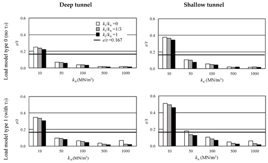 - e/t is larger than 0.167 at kn = 10 MN/m3 for the deep tunnel and at kn < 50 MN/m3 for the shallow tunnel, while e/t is negligibly small at kn ≥ 500 MN/m3. These are the results of the M distribution and N distribution in Figure 7 and Figure 8. This indicates that earth pressure should be considered carefully in soft soils for a shallow tunnel, since tensile stress appears in the lining.
