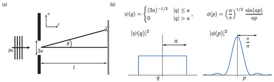 In Kennard’s and Robertson’s uncertainty relations Equations (1) and (2) the uncertainty is expressed in terms of standard deviations. This is, however, not the only way to express uncertainties and sometimes not a well-suited measure [8]. For illustration consider the well-known single-slit experiment, which is schematically illustrated in Figure 2a. An incoming monochromatic plane wave represents an incoming beam of particles. The particles with momentum pass a slit of width and are detected on a screen (or photographic plate) placed at a distance l. The diffraction of particles by such a single slit is frequently used as an illustration of the uncertainty principle [9,10]. The wave function at the screen () may be represented by the following Fourier transform pair illustrated in Figure 2b (for and this is a good approximation of a Fourier transform). The uncertainty in momentum corresponds to the width of the central peak, which contains about 95 of the total probability. Therefore is a very reasonable measure of uncertainty. The standard deviations are then defined as and , where and , which gives and . So if we take these as measures of uncertainty, we have to say that the momentum is completely uncertain (independent of a). The problem stems from the definition of where the probability density is multiplied by a factor , giving increasing weight to the distant parts of the probability distribution. Although the tails of the momentum distribution contain very little probability, they fall off too slowly for to be finite, which illustrates that the standard deviation is not a proper measure of the width of a general probability distribution (even if its good for Gaussians).