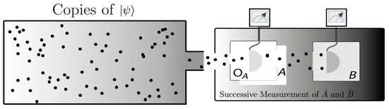 At this point we want to turn to the main topic of the present review article, that is measurement uncertainty relations, which include (1) joint measurability, i.e., the fact that certain pairs of observables cannot be measured simultaneously, and (2) measurement disturbance, i.e., the concept that in successive setups there exist certain pairs of observables that cause a disturbance on the second measured operator as shown in Figure 3. Measurement uncertainty is a topic gaining much attention in current research, both from the theoretic [16,17,18,19,20] and experimental view [21,22,23,24,25,26,27,28,29]. In light of these recent developments Buscemi and Hall proposed information-theoretic definitions for noise and disturbance in quantum measurements and a state-independent noise–disturbance uncertainty relation—an entropic formulation of measurement uncertainty relations [30].