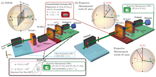 The setup bears some resemblance to the configuration shown in Figure 4. In the first stage of the set-up the necessary eigenstates of the observables under consideration are prepared in DC-1, which makes up four states in total. Afterwards, a successive measurement is conducted, first, the M-measurement in the middle, purple colored section shown in Figure 10 and then the B-measurement at the end of the set-up. The projection M is given by the combination DC-2 + Analyzer + DC-3: first, the initially prepared state is transformed to the eigenstate in DC-2, which interacts with the analyzer and is then recovered by DC-3 preparing the post-measurement state with the probability of occurrence being . Both coils adjacent to the first analyzer control the polar angle of the spin according to Equation (20) and are used to prepare and then conditionally recreate a particular state. The procedure for the B-measurement is analogous, i.e., the fourth coil DC-4 is set to transmit state maximally through the 2nd-analyzer and the orthogonal state with minimum probability. The reconstruction of the state before the detector is irrelevant since the registration of the neutron in the counting tube is spin-insensitive.