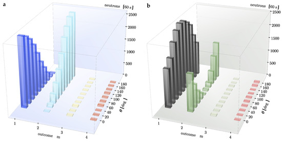 The neutron count rate for (a) and (b) of the four-outcome POVM at a probability weighting of in the case and . Each histogram illustrates the change of counted neutrons depending on the angle of the measurement direction with an increment of . The maximal height in the 60s measurement are approximately 2500. At the initial angle , outcome corresponds to the projector and therefore a maximal count rate occurs in (a), while is associated with and no neutrons are detected. A rotation of the projectors by angle leads to a decrease of counts in and an increase of measured events in for the input state . Likewise, (b) shows the histogram for an input state , which is a distribution phase-shifted to by . Outcomes and from Equation (18) do not occur in the projective limit .