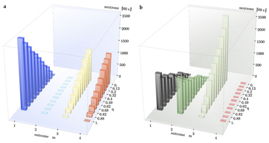 In contrast to Figure 5 the bar chart in Figure 6 illustrates the alteration of count rates for varying statistical mixture q in Equation (18) but with static, unchanged measurement directions and . This means that if q is 0.7 for example, the neutron spins were measured by the operators and with a prefactor of 0.3, hence all four outcome slots are contributing to the statistics.