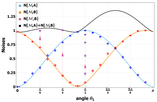 Putting the results together using Equation (8) for both observables A and B, the noise is plotted as a function of the rotation angle in Figure 7. The noises vary between 0 and 1; for a perfect measurement of A is made by which results in a noisefree determination of the eigenstates given by the blue data points, while on the other hand are maximally unpredictable at this point. When the projectors are rotated closer towards observable B, a trade-off between the noises occurs making the discrimination of more difficult and the differentiation of easier. This impossibility of jointly distinguishing the two eigenstates of the non-commuting observables of is known as the measurement uncertainty principle.