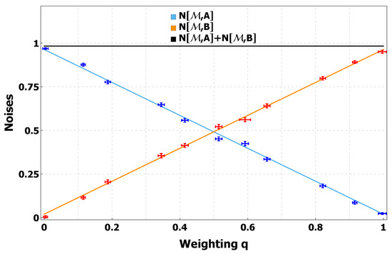 Theoretical lines plus measurement points of in blue and in red for and for varying statistical weighting q. To obtain this plot the operators and are fixed to the extreme values and corresponding to the minima in Figure 7. The black line shows that the sum of the entropy remains constant at the lowest value of Figure 7. As a result, realizing the POVM Equation (18) reduces the overall noise.