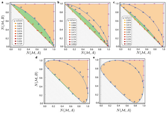 Parametric plots of noises in observable and which indicate the accessible joint measurement uncertainty region , with the blue curve being the result of projective measurements in the plane spanned by -, the orange colored region obtainable by arbitrary projectors and finally the green area demarcating the lowest pairs of noise values only reached by POVMs. The upper panel shows the improvement on the uncertainty relation by choosing the convex combination of the operators and controlled by q, whose color coding is listed for (a) , (b) and (c) . In the lower panel, the included angle is very close or below the critical value of . Apparently the orange region is already becoming convex and further improvements by POVMs are not feasible for (d) or possible for (e) .