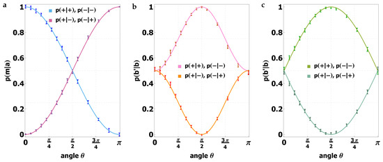 Unlike for noise–noise uncertainty relations, an error correction procedure of the post measurement state must be taken into account which can drastically change the degree of disturbance. Setting the experimental observable to , and the oscillation of the conditional probabilities depending on the angle have been recorded and are plotted in Figure 11. The left panel Figure 11a illustrates a sine/cosine behavior as expected for the probability of preparing the input state corresponding to the eigenvalue a and receiving measurement outcome m. Based on the course of the conditional probabilities, one realizes for that , that is the modulus of the probability (centered at ) when leaving the post measurement state as is surpassed by the curve, where the optimal error correction is employed.