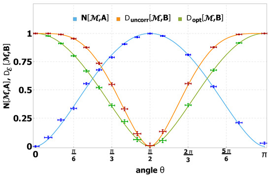 The interpretation of the blue noise curve is all clear by now: the measurement starts perfectly correlated leading to vanishing noise and loses its correlation the closer M is to observable B before further rotation increases the anti-correlation and makes smaller again. The disturbance has a reciprocal form to the noise. The information about the initial states is maximally destroyed by the first apparatus and there is no certainty about the second measurement outcome. The more approximate B is measured in the first apparatus the better the correlations are conserved. The red-colored data points show , the disturbance when no correction is made and the -measurement is made on . However, as the green curve in Figure 12 implies, the situation can be improved by correlating the random variable of the second apparatus with the random output variable of the first measurement instrument. In terms of complete positive trace-preserving maps, this can be written as the operation