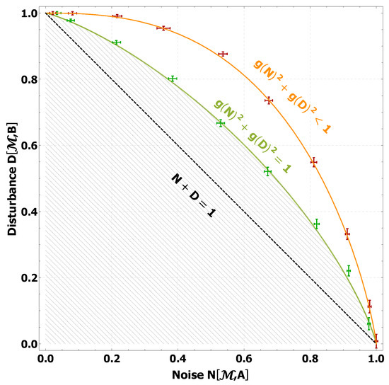 The green-colored result, therefore, shows the minimal disturbance, where the second apparatus makes a measurement on the state , the state rotated onto the closest eigenvector of B. Finally, it remains to have a look at the plot of noise vs. disturbance. In Figure 13 three curves are shown. The red curve corresponds to the uncorrected uncertainty relation and the green one to the corrected in accordance with the color-coding of Figure 12. The white-hatched area is the region not reachable by sharp, projective, joint measurements M of the two non-commuting observables . The green boundary of the uncertainty region Equation (19) is saturated for this particular case, while the Maassen–Uffink like relation , given by the black line, displays an underestimation of the obtainable noise–disturbance values.